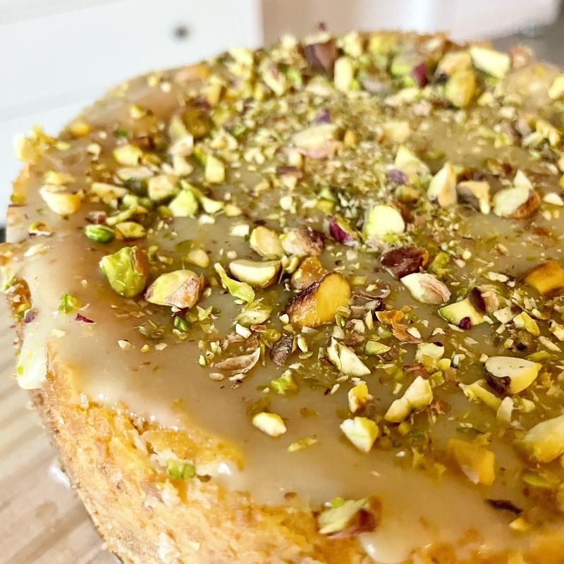 Perfectly creamy cheesecake with pistachio paste, white chocolate topping, sprinkled with pistachios and flakes of salt. Delicious combination of flavors!
